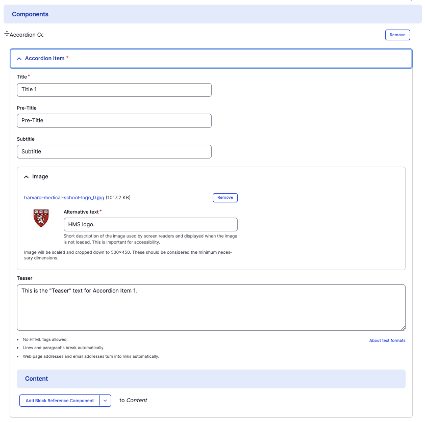 - The accordion component will appear. Complete the following fields that will be displayed when the accordion is closed or expanded: