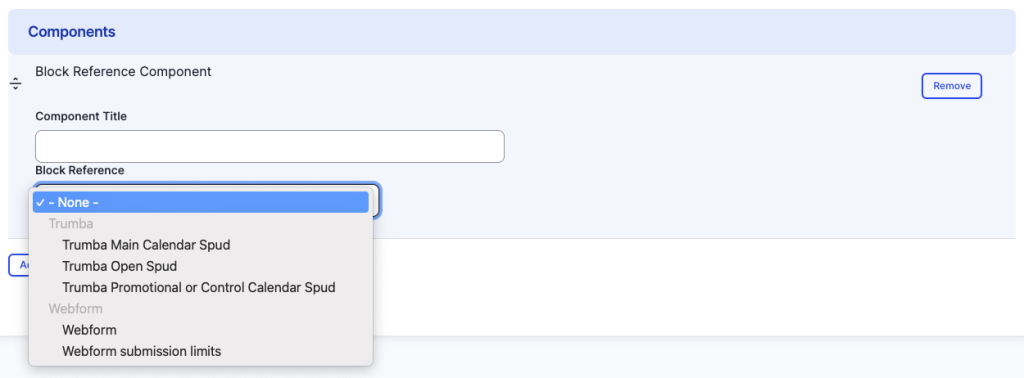 This guide demonstrates how to add the Block Reference component to embed an already existing block, such as Trumba or a content block, to your site.