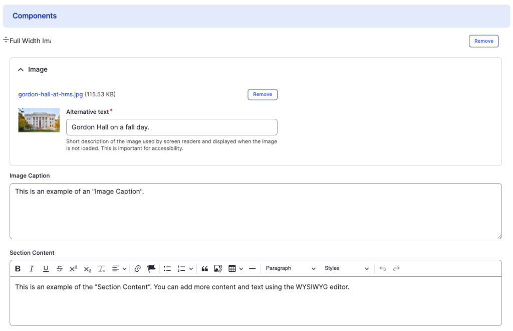 - The full-width image component will appear. Complete the following fields that will be displayed: