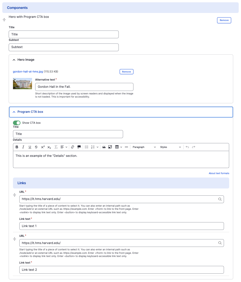 This guide demonstrates how to add the Hero with Program CTA box component.
