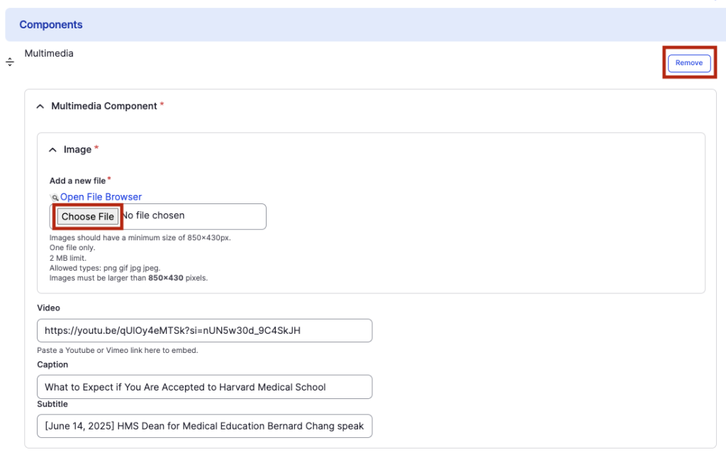 This guide demonstrates how to add the Multimedia component, which can be used to display a full-width image or full-width video with a caption. Videos must be hosted on YouTube or Vimeo to be added to the site.