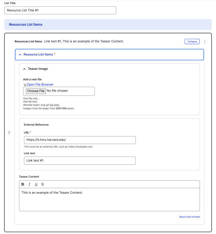 - Resource List Items - To add a resource, select Add Resources List Items. A new resource list item section will appear. Tap the drop-down to expand. The recommended number of resources to add in a section is 1-3.