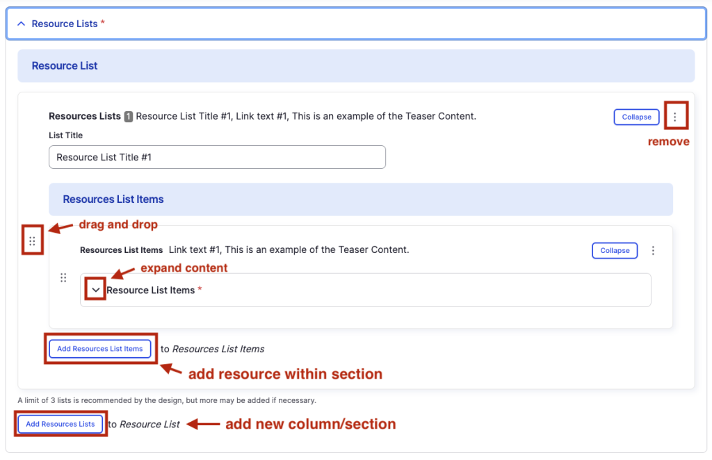 - To add another column with a new section heading, select Add Resources List. The recommended number of columns are 2-3.
