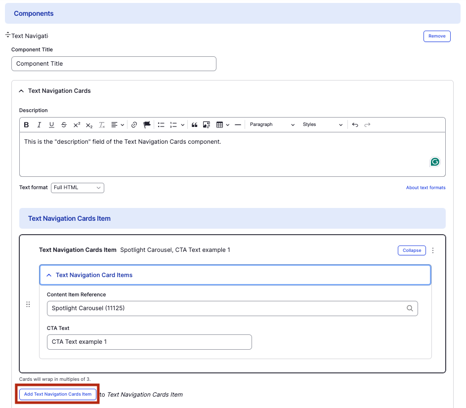 - To add another text navigation card, select Add Text Navigation Cards Item.