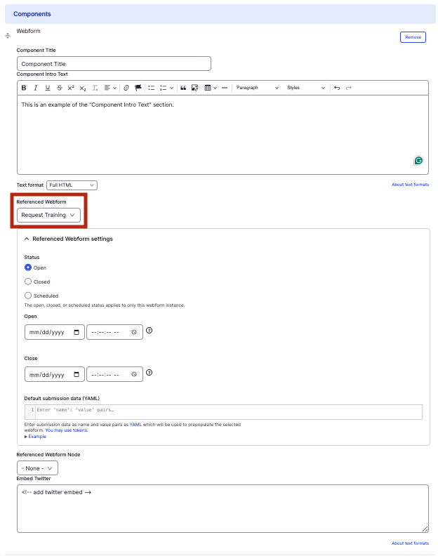 - Referenced Webform - Select an existing Webform to embed. If you have not already created a webform, contact Michael Garofalo at warp-web-help@hms.harvard.edu for assistance.